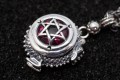 賢者の石をイメージした合成ルビーを ヘキサグラムを刻んだケースに納め、 その周りには自らの尾を噛んで飲み込 んで環となった蛇 ウロボロスがクルクル 回せるように取り付けられています。 完全、永遠、不滅の象徴とされる ”ウロボロス” 鉛などの卑金属を金に変える際の触媒となると考えた霊薬である ”賢者の石” コレであなたも錬金術師 【 素 材 】 シルバー925 【 重 量 】 17.1g 【 寸 法 】 縦35 × 横23 × 厚12 (mm) 【 石 】 合成ルビー 10㎜ ラウンドカット 【 チ ェ ー ン 】 スパイク 太さ 2.3 (mm) 留め金具 : ロブスタークラスプ 長さ 45/50(cm)よりお選びください。